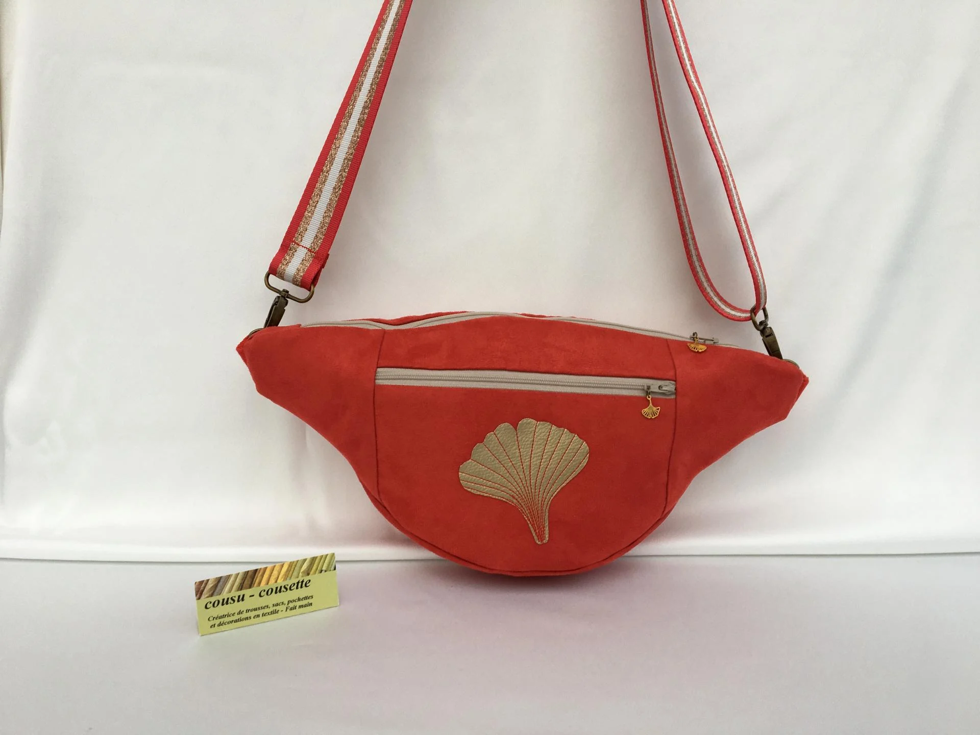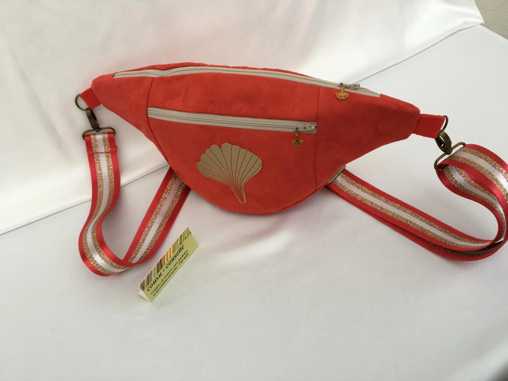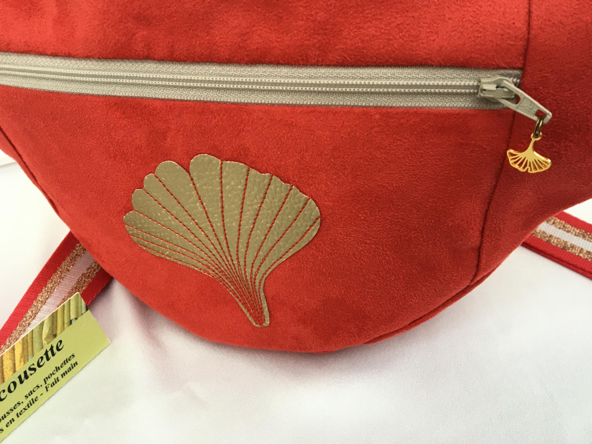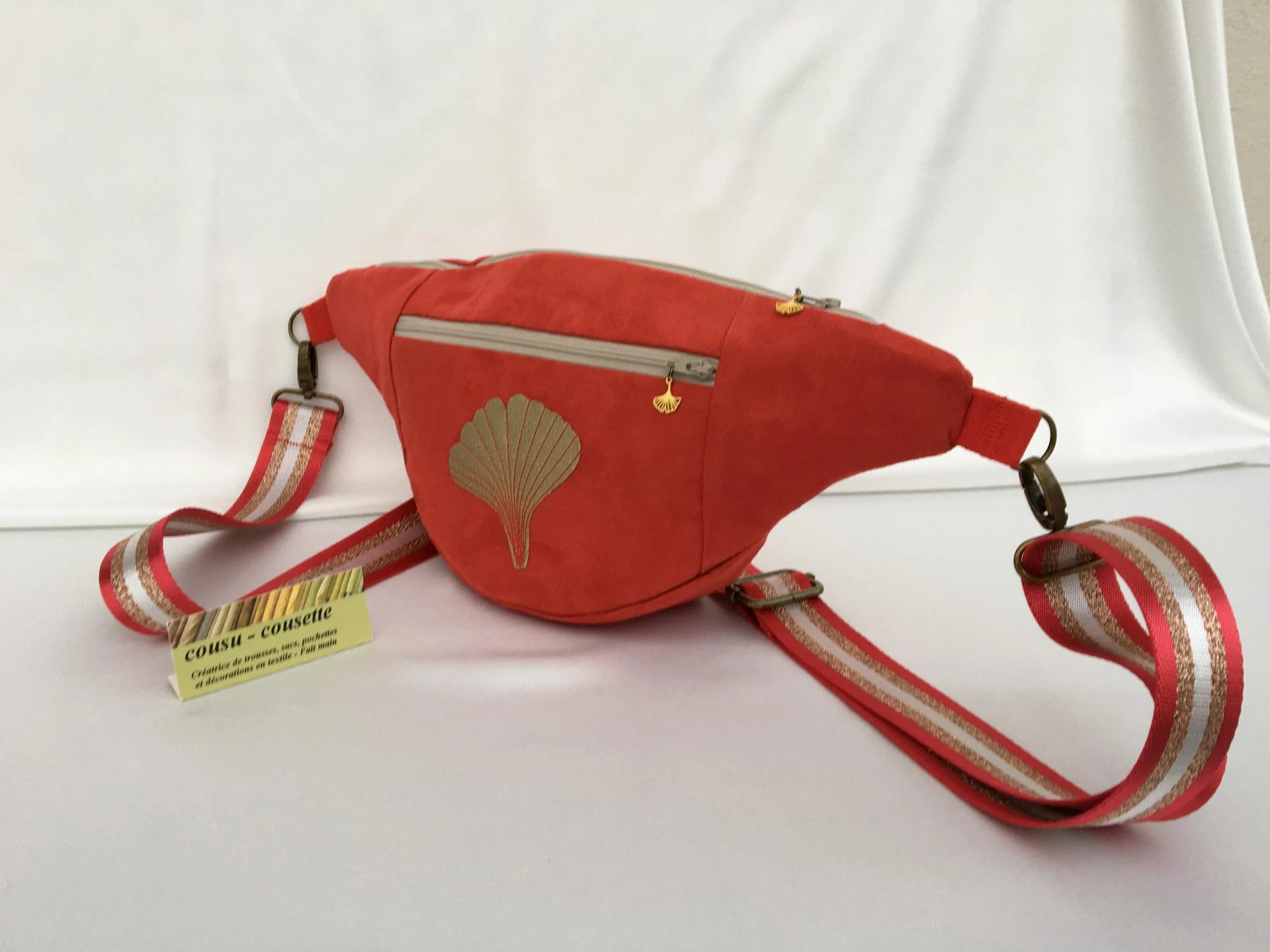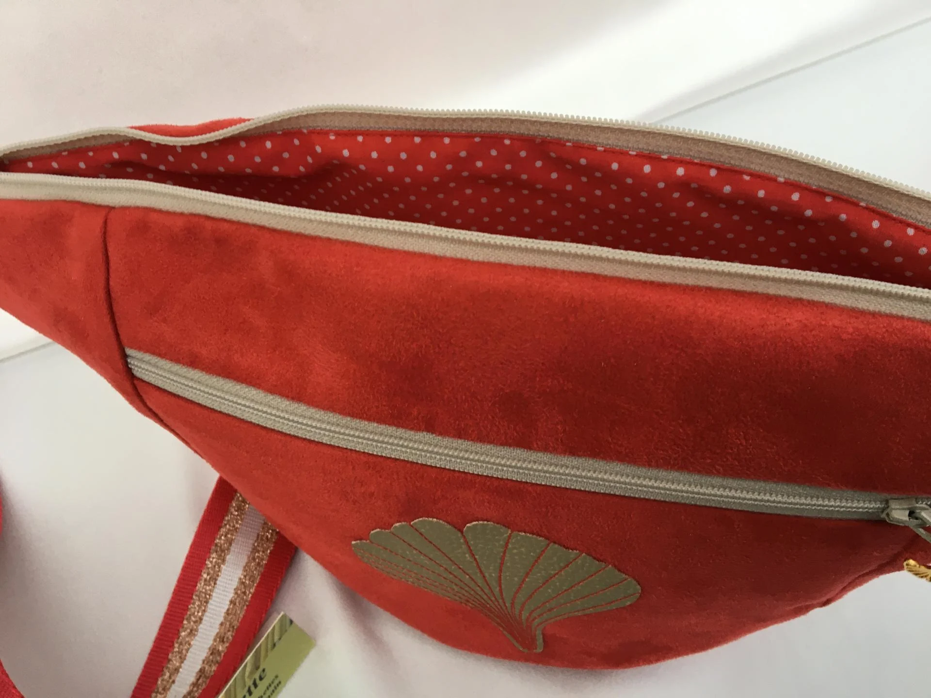 Ce sac banane vous accompagnera dans vos promenades et vos sorties. Il est confectionné en suédine rouge, et possède une poche devant avec une fermeture beige de 20 cm. Il se ferme avec une fermeture beige de 30 cm. Il est doublé en coton rouge à pois. Il se porte en bandoulière avec une jolie sangle rouge et or de 120 cm, sangle amovible avec 2 mousquetons.