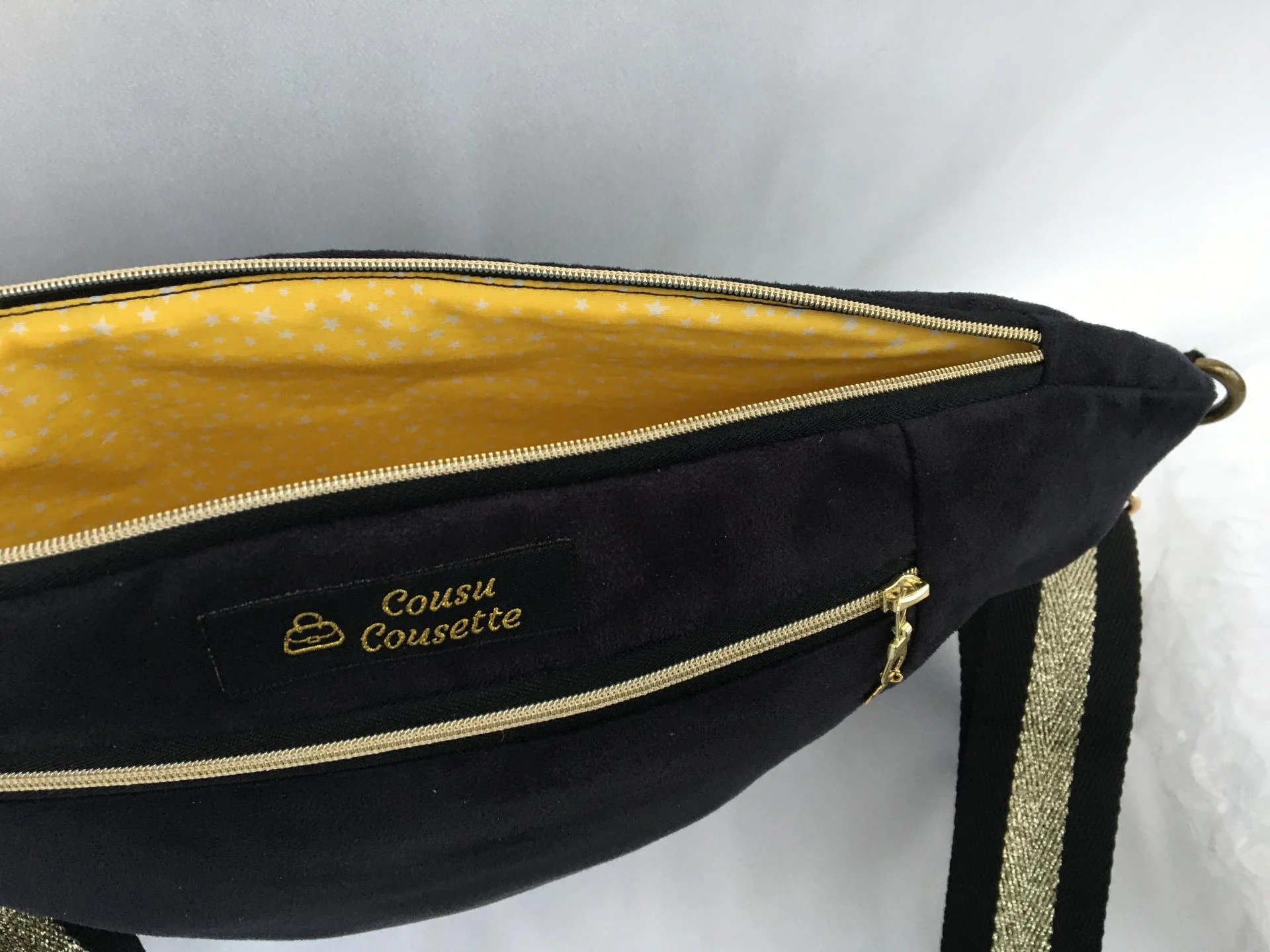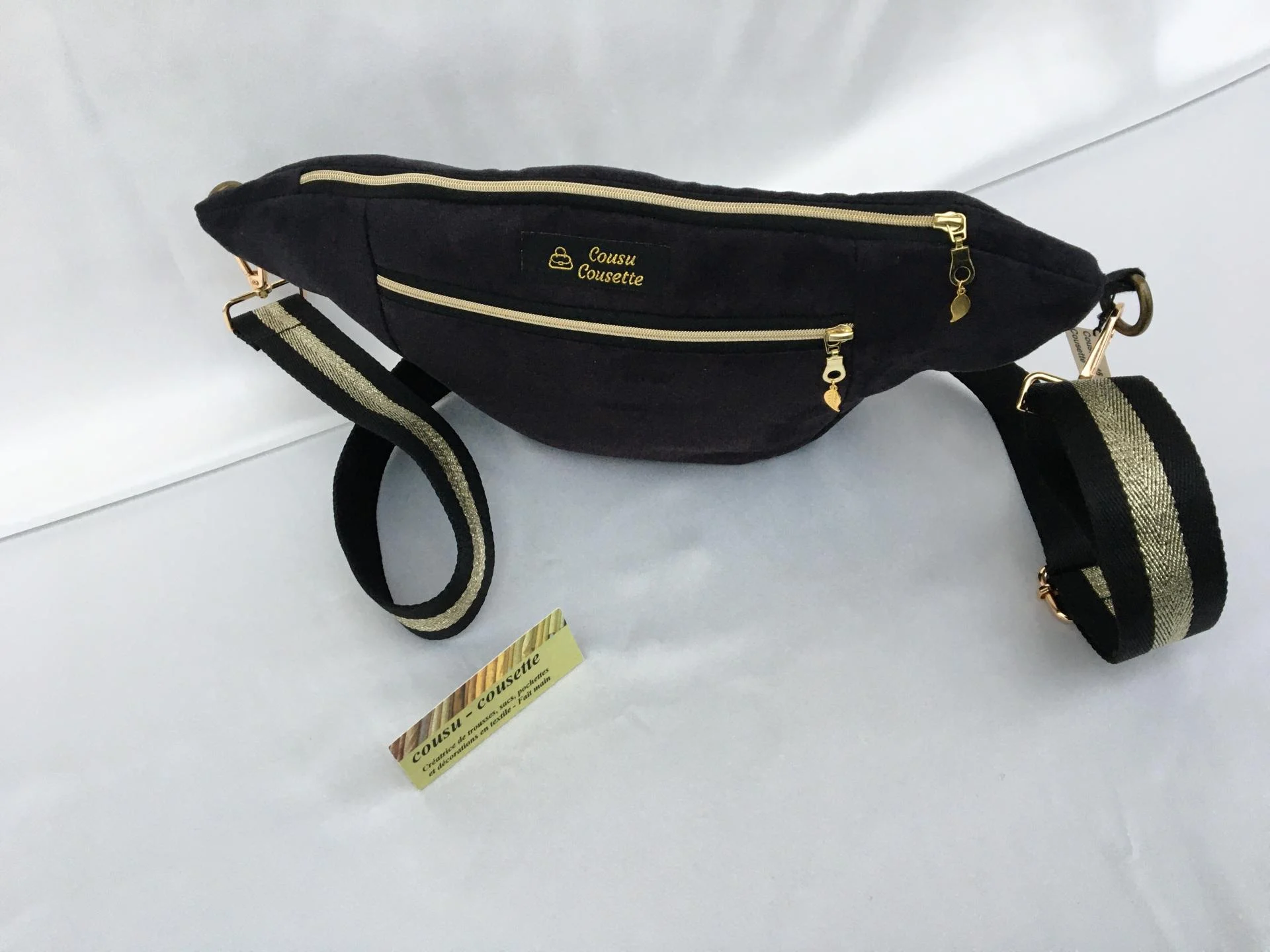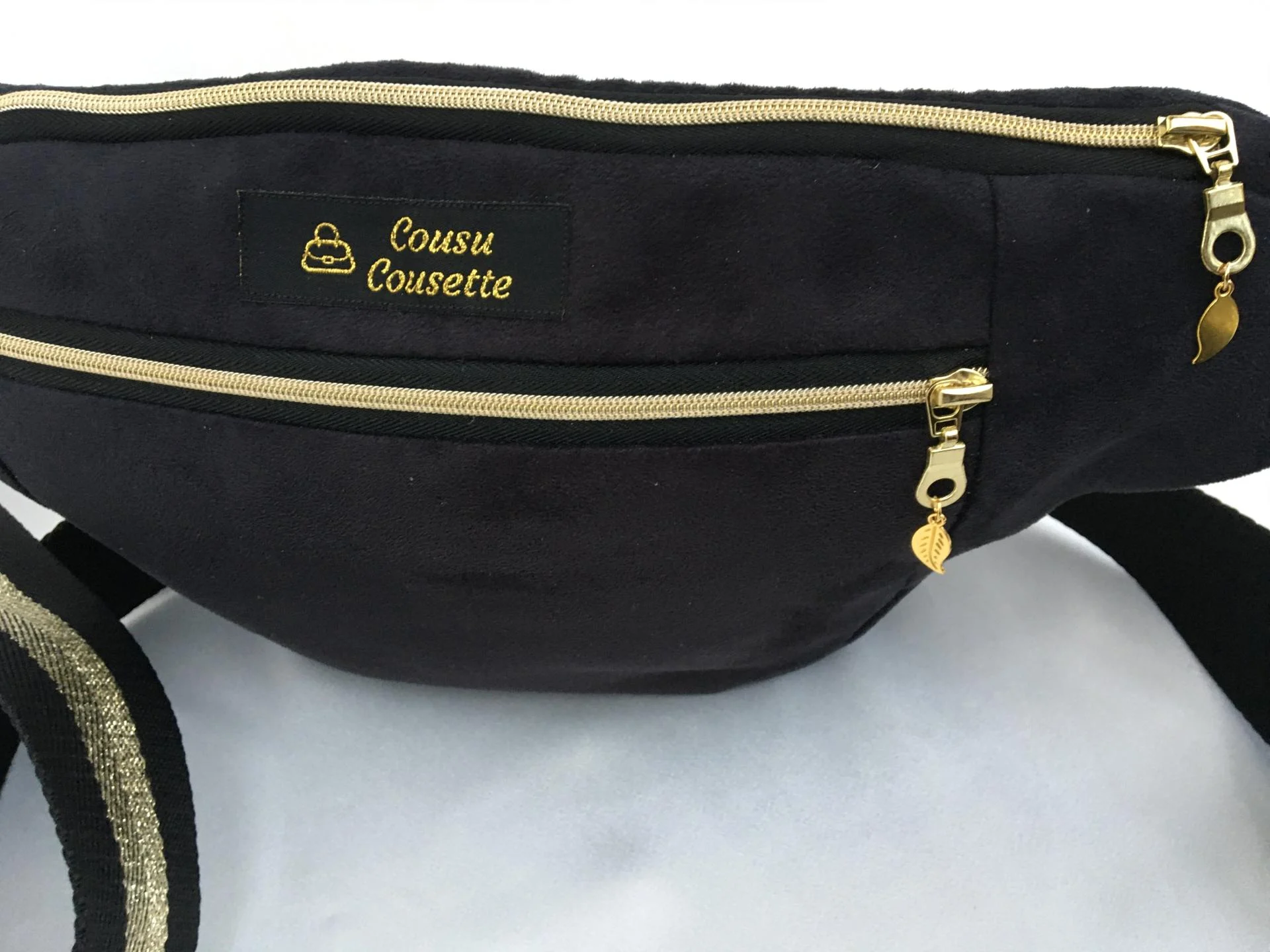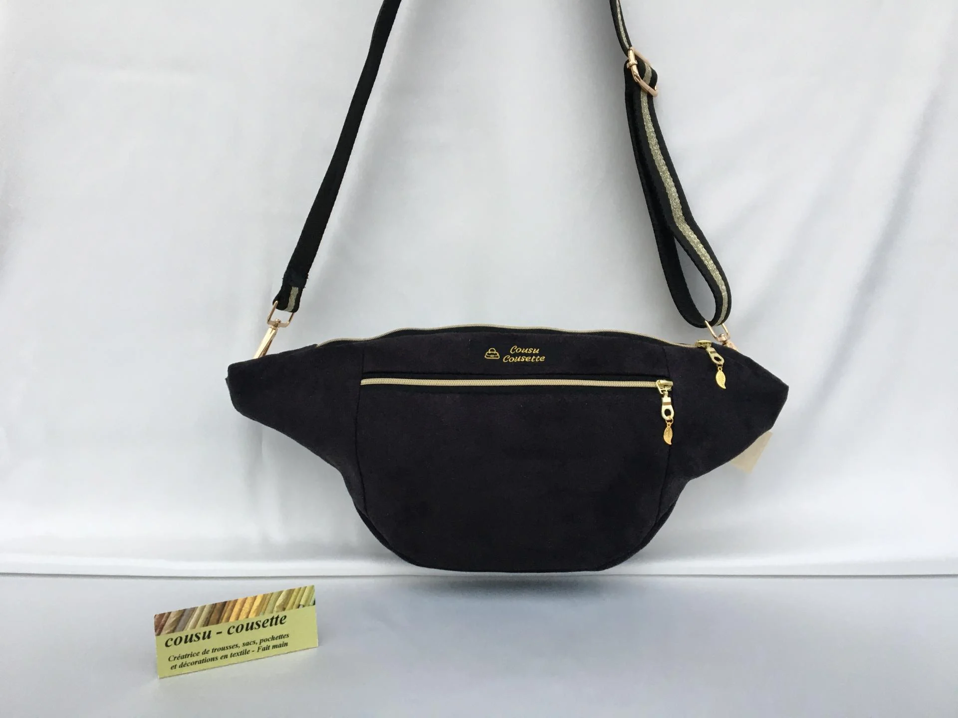 Ce sac banane vous accompagnera dans vos promenades et vos sorties. Il est confectionné en suédine noire, et possède une poche devant avec une fermeture noire doré de 20 cm. Il se ferme avec une fermeture noire doré de 30 cm. Il est doublé en coton beige à pois. Il se porte en bandoulière avec une sangle amovible de 120 cm, sangle amovible avec 2 mousquetons.