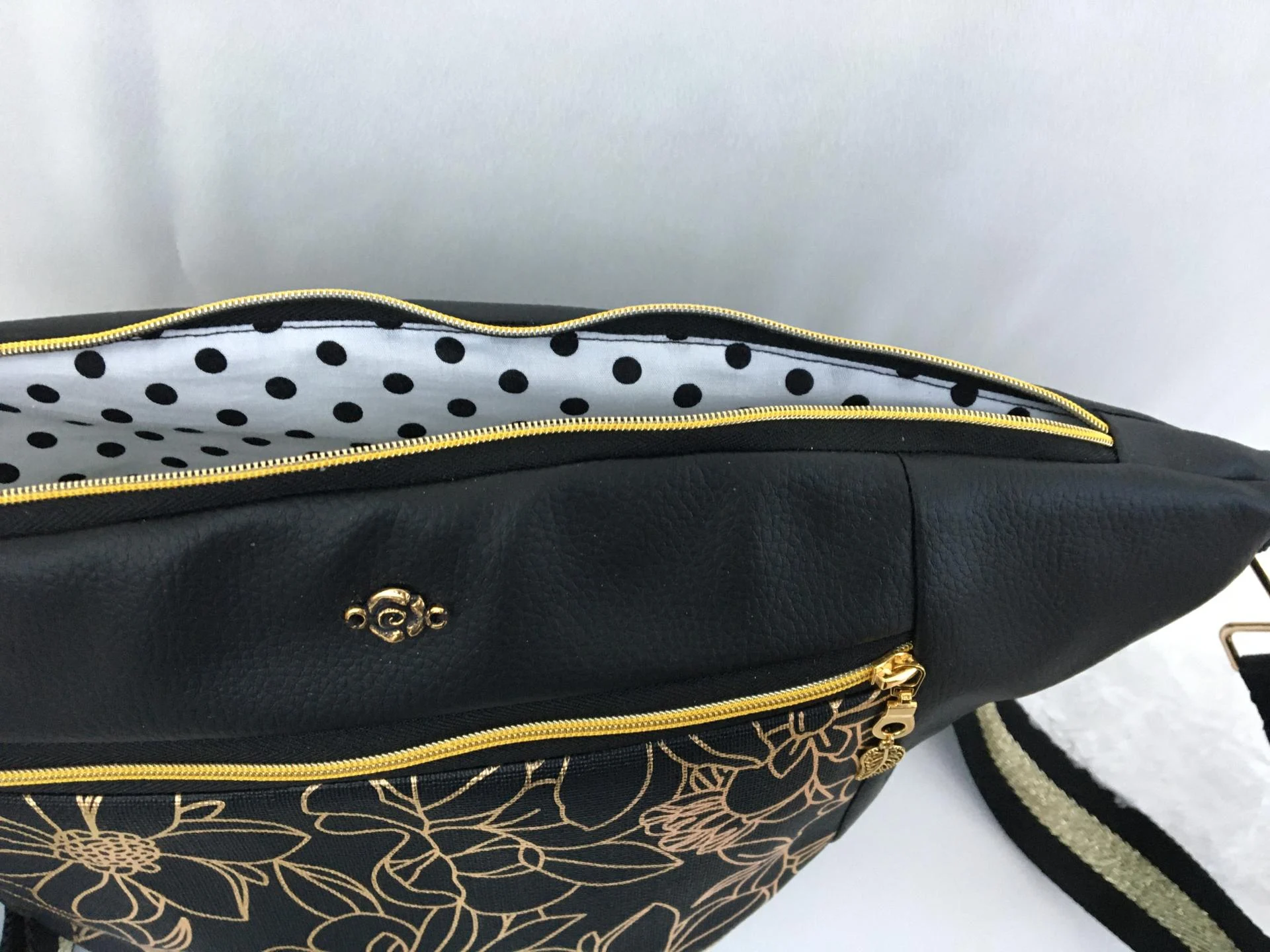 Ce sac banane vous accompagnera dans vos promenades et vos sorties. Il est confectionné en skaï noir, et possède une poche devant avec une fermeture noire doré de 20 cm. Il se ferme avec une fermeture noire doré de 30 cm. Il est doublé en coton blanc à pois. Il se porte en bandoulière avec une sangle amovible noire et doré de 120 cm, sangle amovible avec 2 mousquetons.
