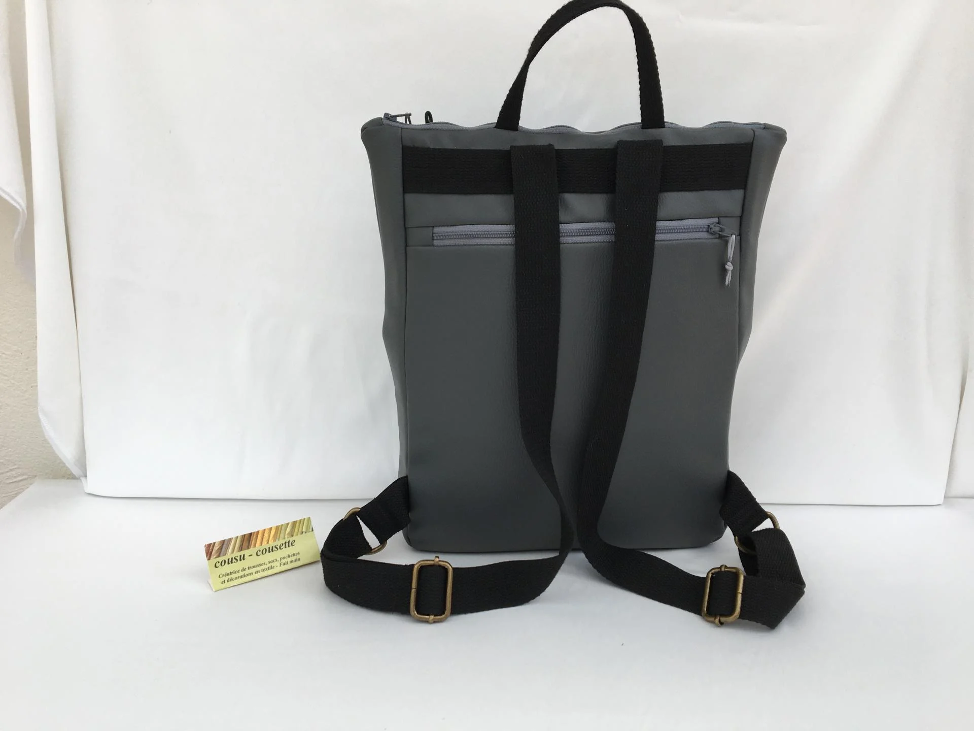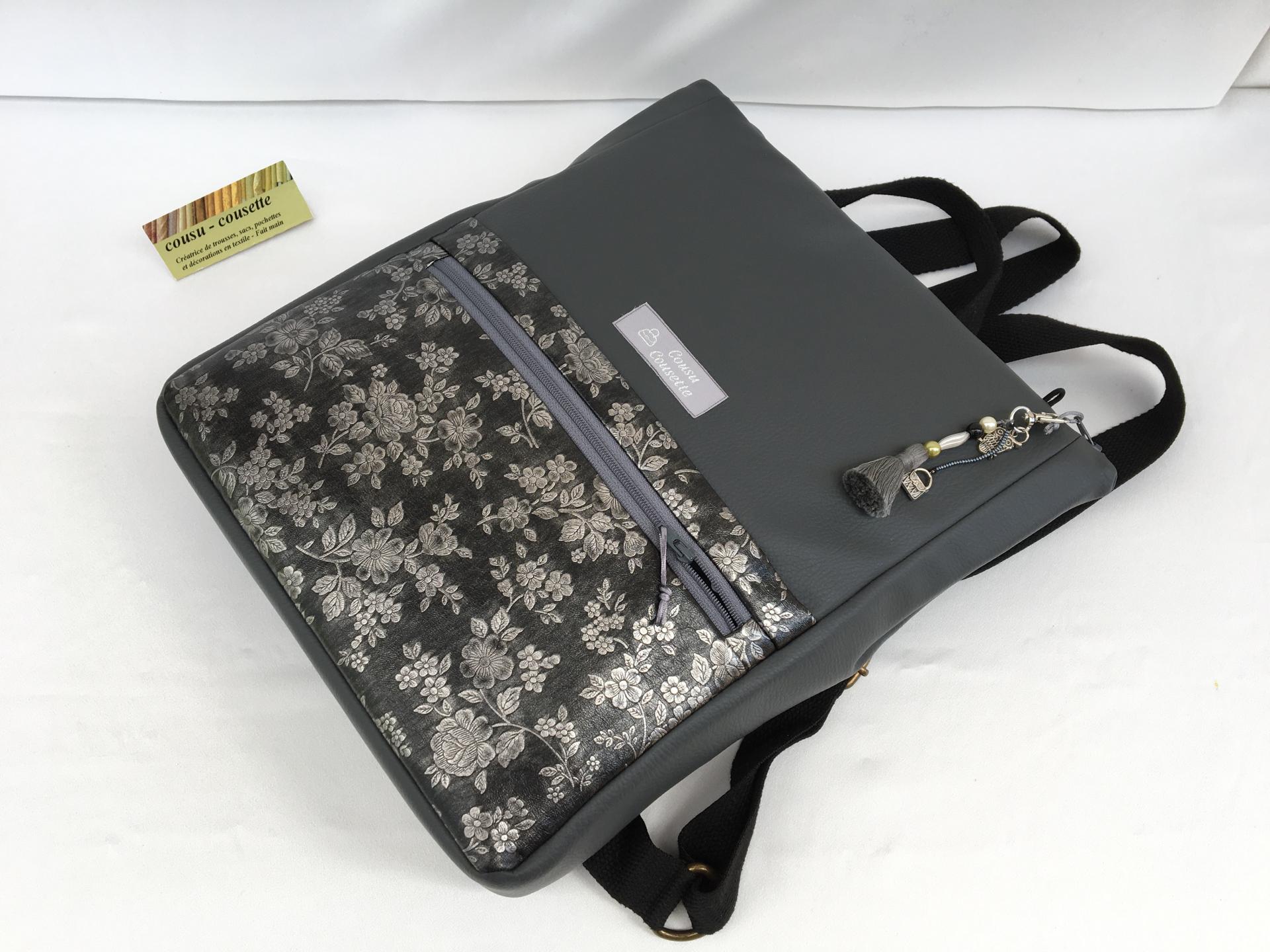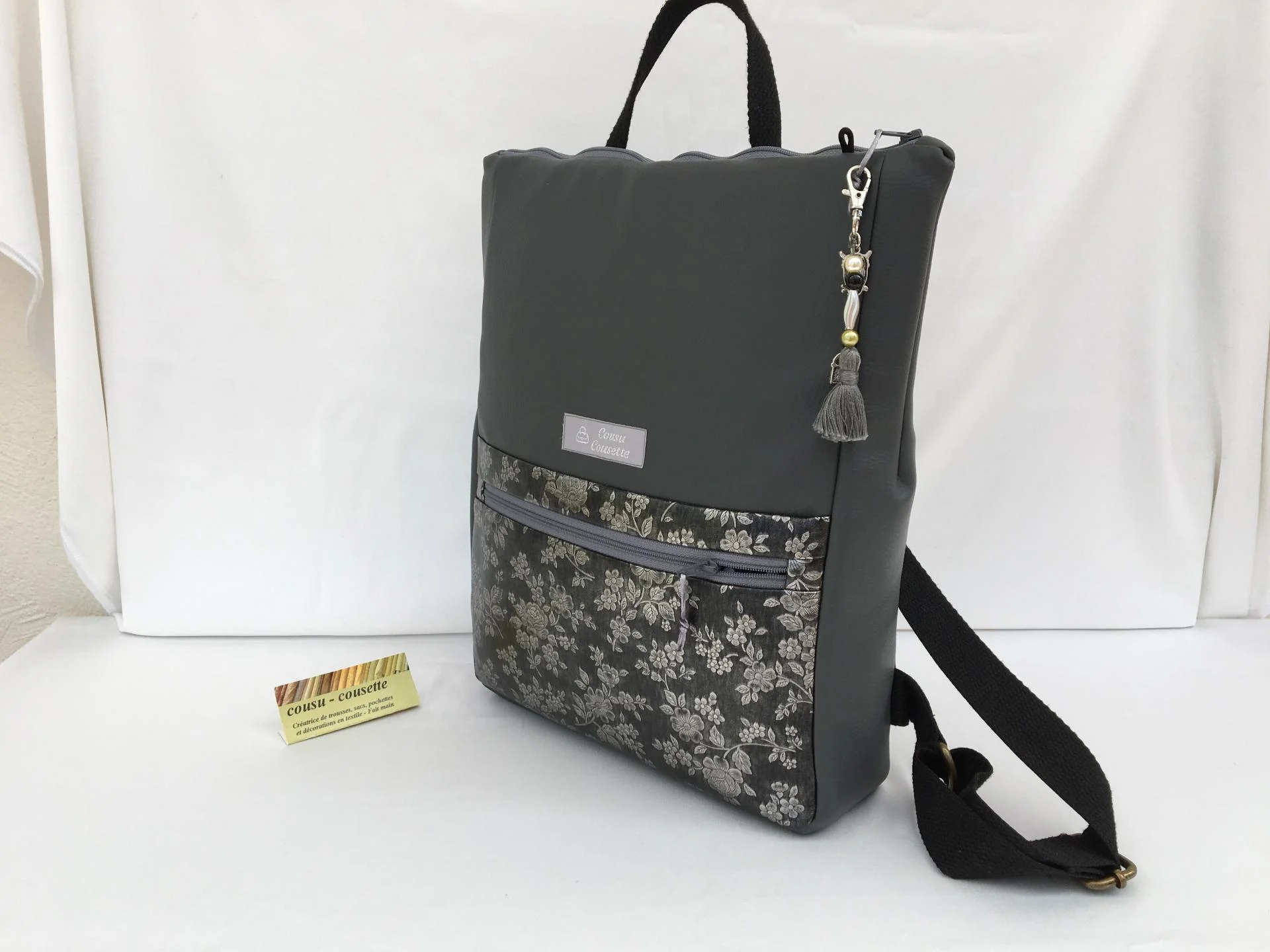 Ce sac à dos élégant s'accordera parfaitement avec vos tenues de tous les jours. Il est confectionné en skaï gris et skaï fleurs. Sur le devant du sac une poche en skaï fleurs fermée par une fermeture grise de 22 cm. Au dos du sac sous les sangles, une poche fermée par une fermeture grise de 21 cm. L'intérieur est doublé en coton noir à pois blanc, avec une poche blanche de 16 cm x 19 cm d'un côté, et de deux grandes poches pour y ranger votre tablette ou ordinateur portable. Il se porte comme un sac à dos avec des sangles en coton tressé noir. Le sac se ferme avec une fermeture grise de 28 cm. La structure est renforçée pour plus de confort.