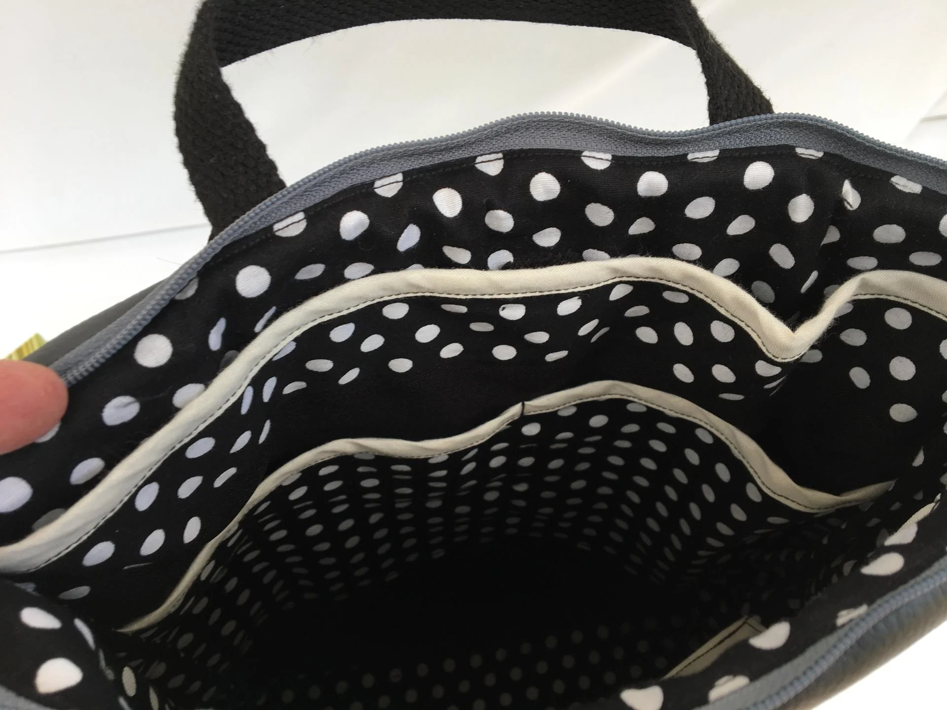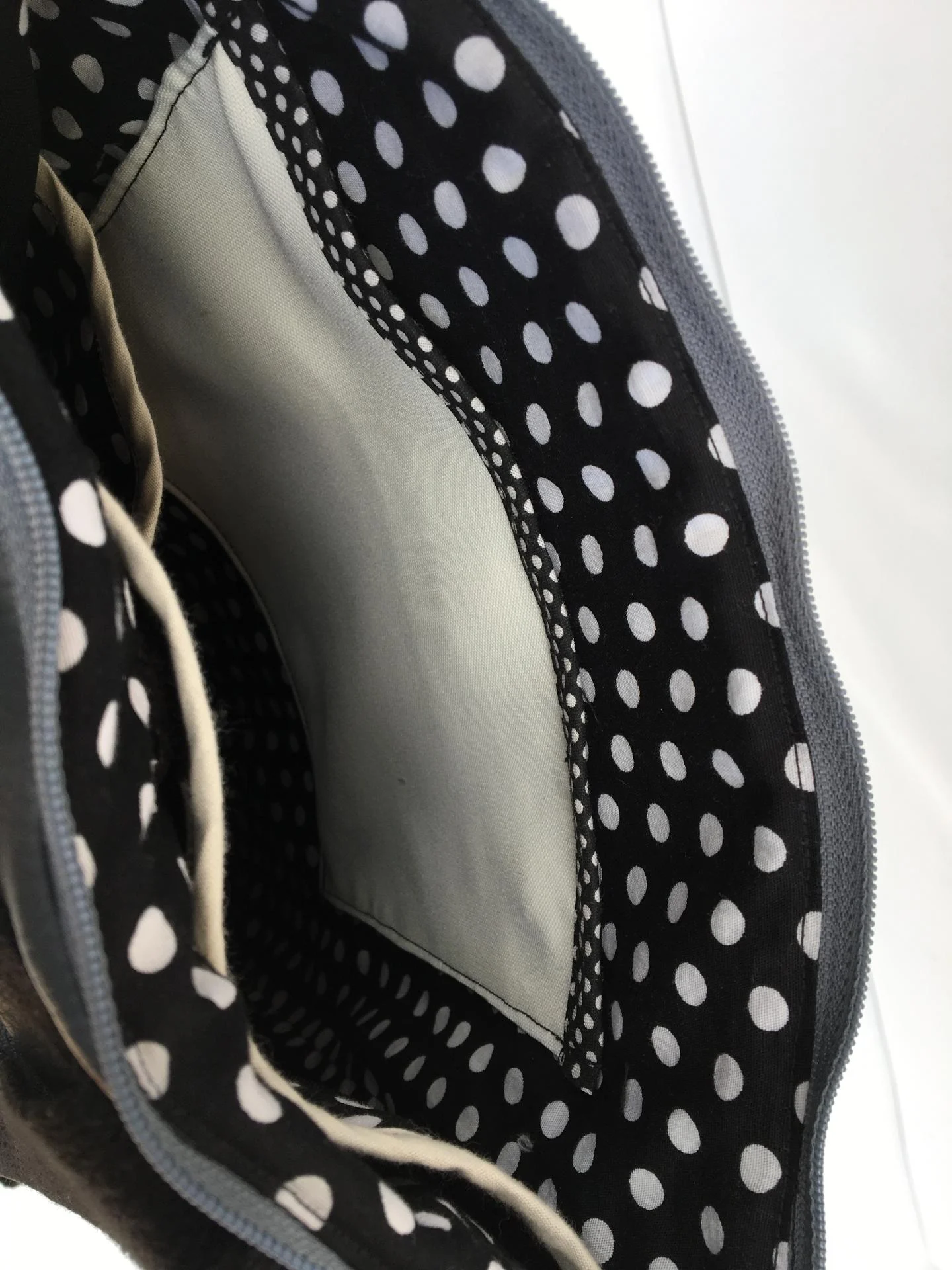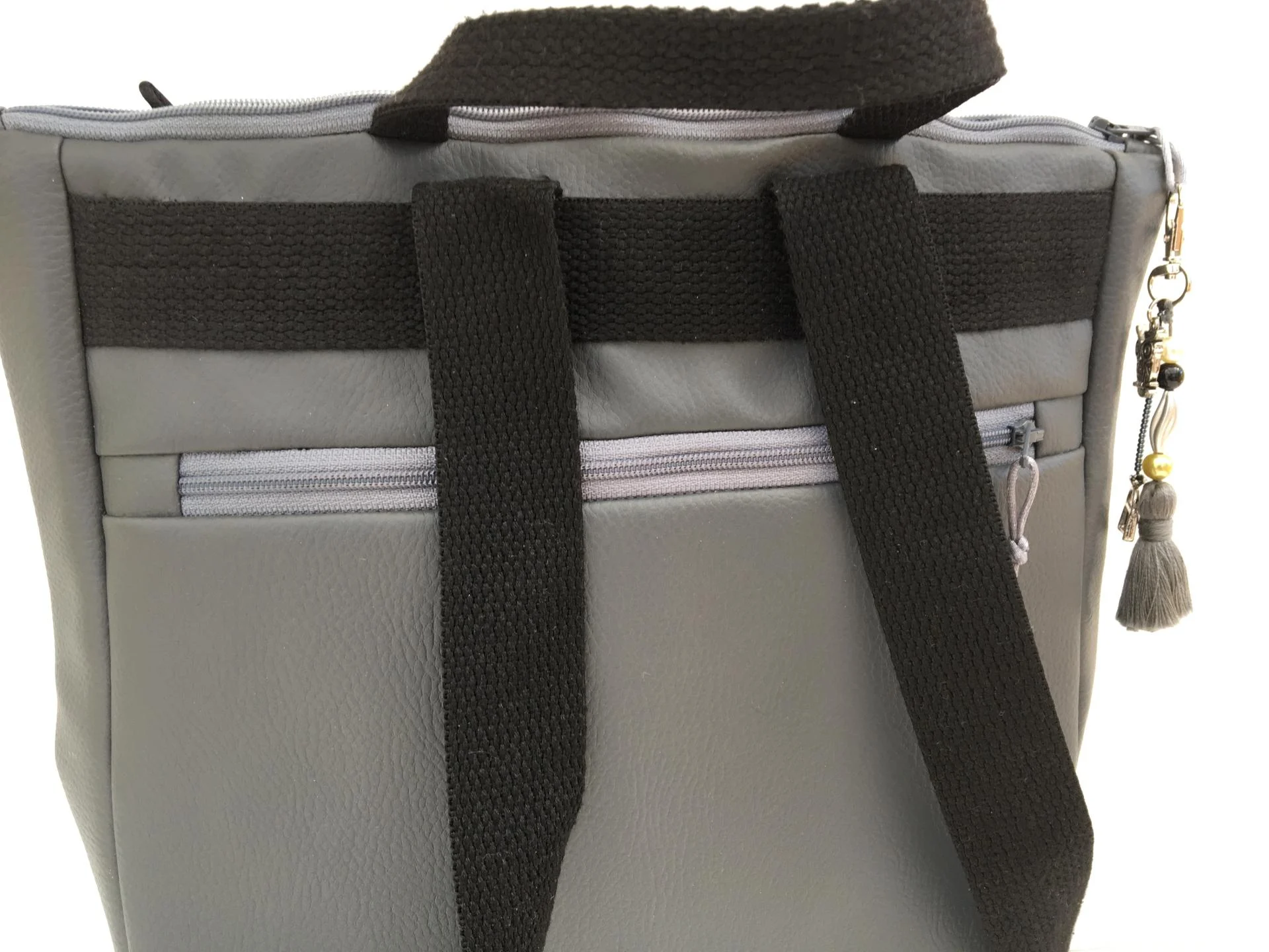 Ce sac à dos élégant s'accordera parfaitement avec vos tenues de tous les jours. Il est confectionné en skaï gris et skaï fleurs. Sur le devant du sac une poche en skaï fleurs fermée par une fermeture grise de 22 cm. Au dos du sac sous les sangles, une poche fermée par une fermeture grise de 21 cm. L'intérieur est doublé en coton noir à pois blanc, avec une poche blanche de 16 cm x 19 cm d'un côté, et de deux grandes poches pour y ranger votre tablette ou ordinateur portable. Il se porte comme un sac à dos avec des sangles en coton tressé noir. Le sac se ferme avec une fermeture grise de 28 cm. La structure est renforçée pour plus de confort.
