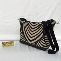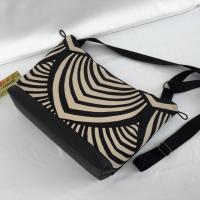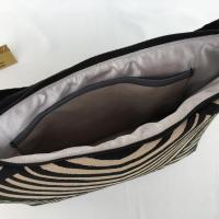 Sac Zèbre Vintage, un petit sac élégant style vintage. Il se porte avec une sangle noire réglable en coton tressé de 135 cm. Il est confectionné en tissu noir et beige aux motifs zèbrés, avec un arrondi à la fermeture. L'arrière du sac et en suédine noire avec une poche fermée par une fermeture noire de 24 cm garnie d'une perle à la tirette, pour y ranger vos clés. Le bas du sac est en skaï noir. L'intérieur est doublé en satin gris avec une poche de 14 x 18. Il se ferme avec une fermeture noire de 28 cm garnie d'une perle à la tirette. La structure du sac est renforcée pour un meilleur maintien. Haut 22 cm, larg 32 cm, fond 24 cm x 8 cm.